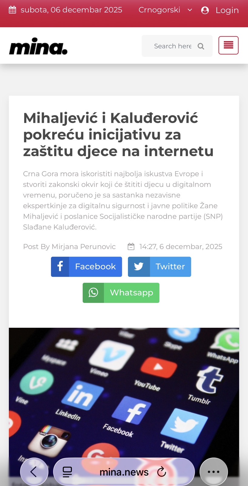 06 Dec SAOPŠTENJE ZA JAVNOST Mihaljević i Kaluđerović pokreću inicijativu za zaštitu djece na internetu i društvenim mrežama